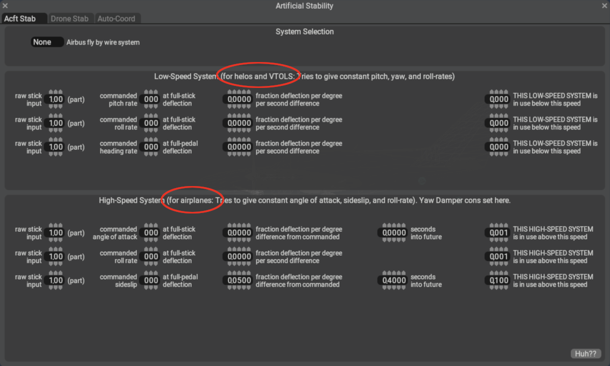 These types of controls are generally found on some VTOLS and fly-by-wire type aircraft that have CPUs and sophisticated control algorithms. For Airbus style control, there is a pulldown on the Acft Stab tab to specify the type of Airbus Control. There is a A320 option, and an A330 option with some additional settings. To configure your own custom parameters, utilize the NONE pulldown option, whose parameters are shown above.