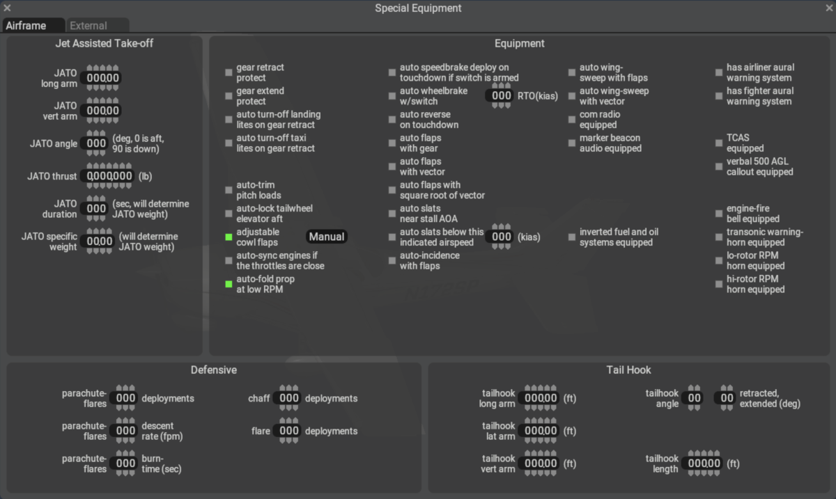 This Special Equipment page is a contextual page, with several widgets only appearing depending on the configuration options selected. While most contextual widgets will appear based on the checkbox options enabled on this screen, there are a few widgets that will appear for options selected on other pages of PlaneMaker.