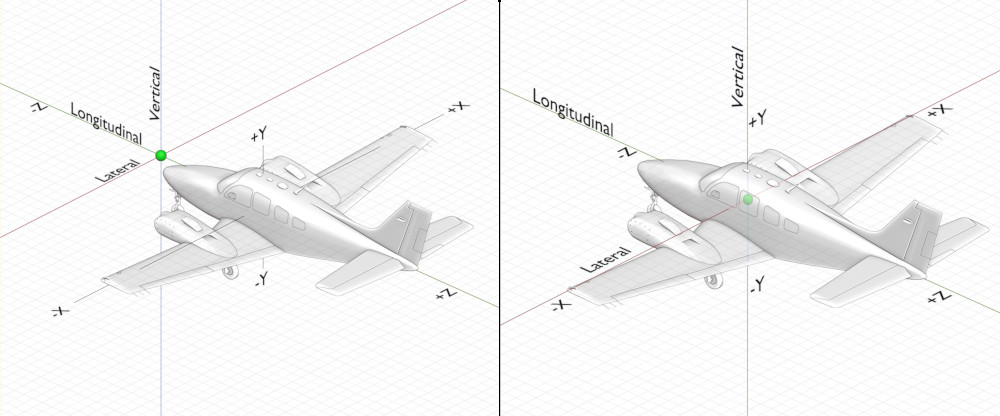 Many elements in PlaneMaker require you to specify a location in Cartesian coordinates. PlaneMaker uses the nomenclature, Longitudinal, Lateral, and Vertical to denote the Z, X and Y directions respectively. The global origin datum is an arbitrary point and you may place your geometry anywhere relative to the origin datum. Some authors will make the origin at, or some distance in front of, the nose of the aircraft, so that all longitudinal values (z) are positive. Others will align the empty Cg location of the aircraft at the origin datum, in which case points forward of the origin are negative and points aft arer positive. The image below shows the ACS with both origin options.