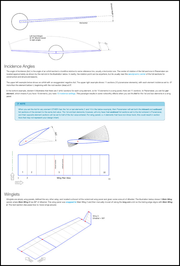 Modeling Concept Pages are provided as a type of Notebook for various topics. These pages will typically contain more detailed instructions and explanations of X-Plane's various models and how they are configured using PlaneMaker. An example from the "Modeling Geometry > Wings" section is shown at right.