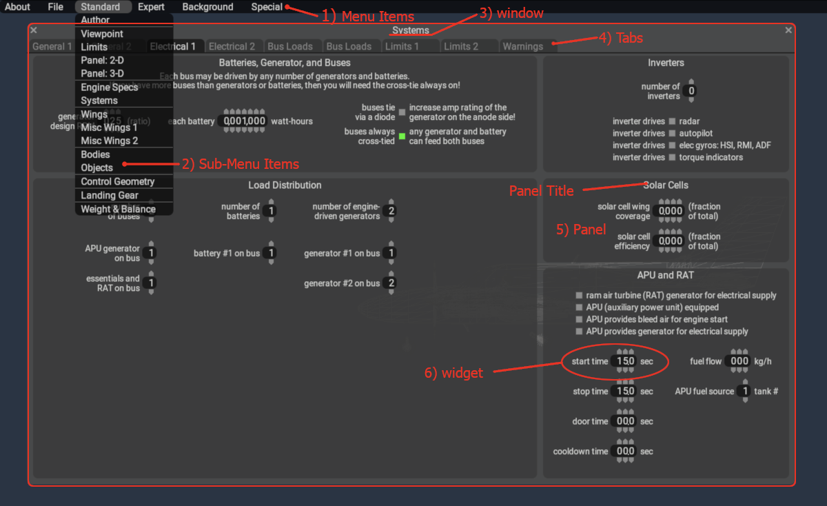 PlaneMaker's User Interface (UI) consists of numerous widgets (also called parameters) spread throughout the program. A widget may be a pulldown menu, a text box, a graph, a number box or checkbox, etc. These widgets are organized and grouped according to their functionalities, with related widgets typically appearing together. Widgets are located through a sequence of UI navigation elements and generally navigated to in the order shown below. The image at right shows the elements listed in the table at left.