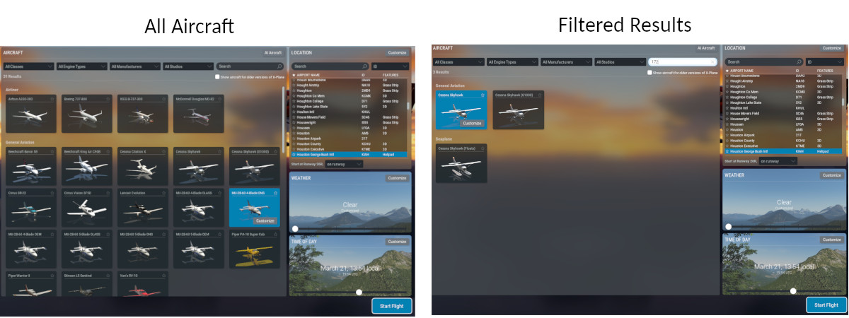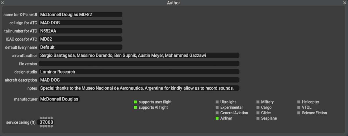 The AUTHOR window is provided to enter high-level meta-data about your aircraft. The various meta-data fields are used for multiple purposes. Many fields are used by X-Plane's aircraft browser window, allowing users to search for aircraft using multiple terms. The image below (right side) shows the results when searching for 172, allowing users to quickly select your aircraft. Other fields are used by X-Plane's ATC system, and still others may be used by plugins to query this meta-data to see if your aircraft is loaded and provide aircraft specific features. The more information you can provide the better. Hover over the various fields above and click to get more information about each.