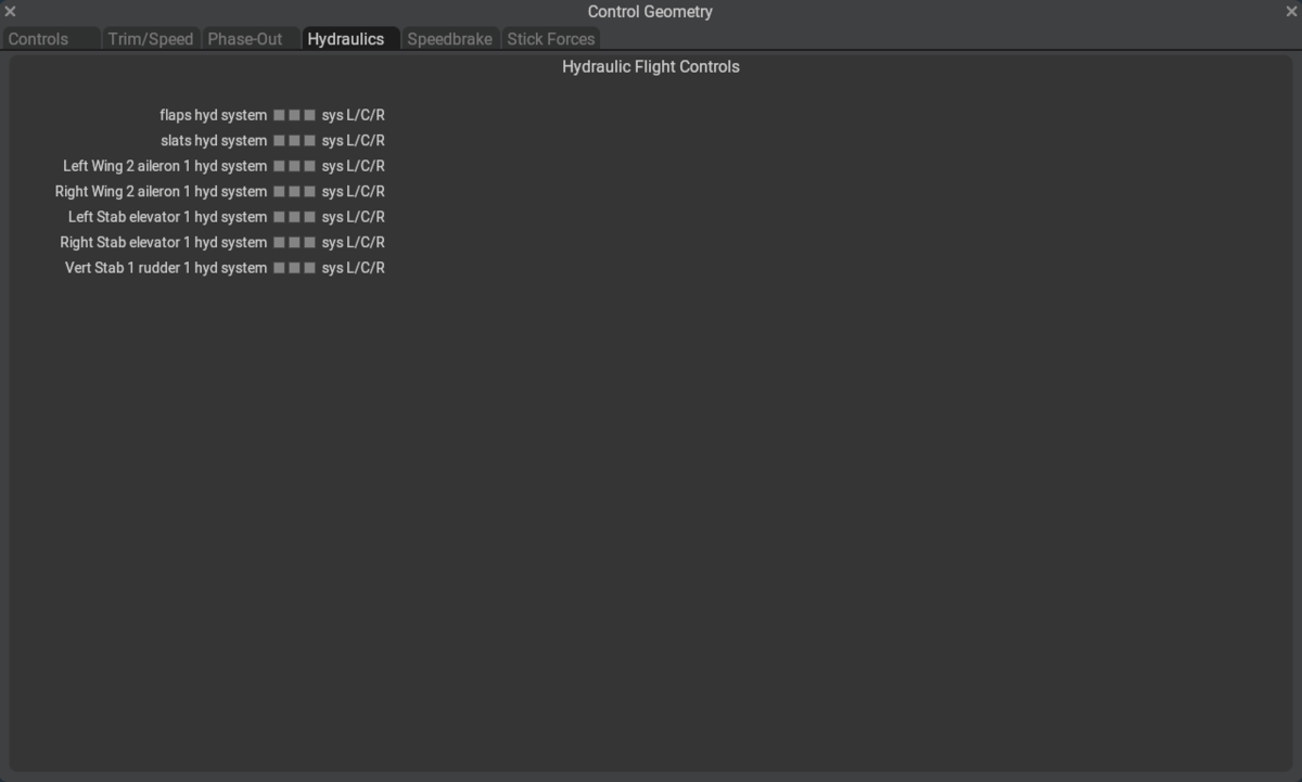 This Hydraulics Tab is used to assign control surfaces to X-Plane's hydraulic systems, assuming that hydraulic sources have been configured on the Standard > Systems > General 2 Tab > Hydraulic Sources panel. Control surfaces do not have to be assigned to a hydraulic system; however, when they are, then their deflections and deflection rates will depend upon the state of hydraulic power available. This page is only used to assign control surfaces to hydraulic sources.