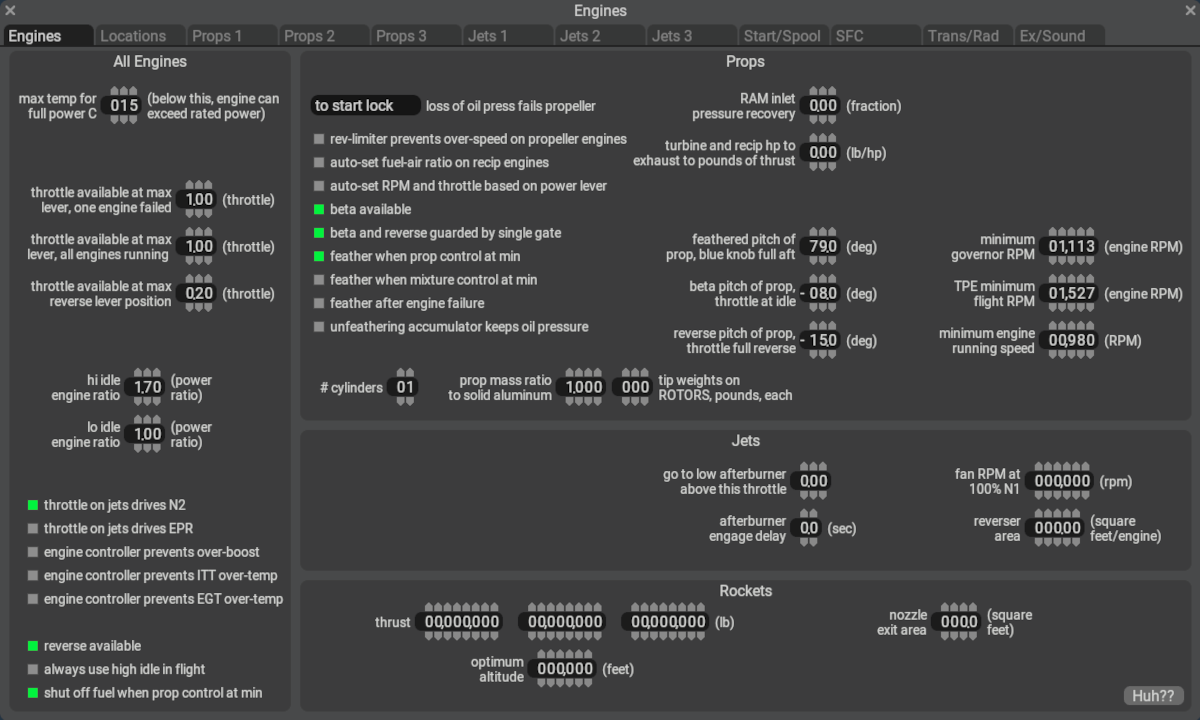 This Window is used to configure high-level parameters of the engine model. Some of the widgets are contextual and dependent upon what type of engine is selected on the Engine Specs > Locations Tab.