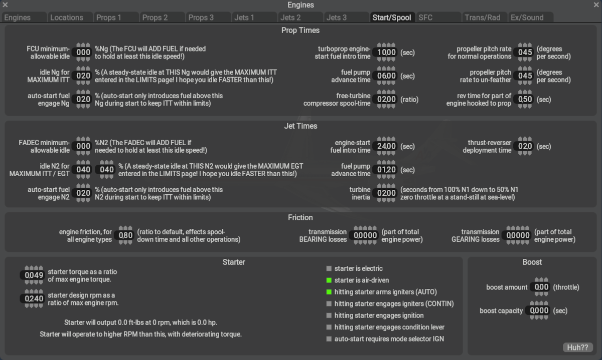 Modeling dynamic systems such as engines and their control systems involves accounting for linkages, components and the engine designs themselves, where each have their own unique dynamic behaviors and response times that all affect how the overall system responds to inputs and impulses. This Start/Spool Tab is used to configure parameters and model various components that affect the Starting and Spooling Behavior of engines.