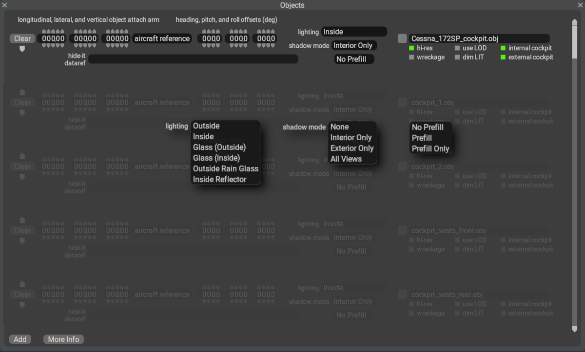 When OBJs are added to the aircraft via this window, then there are additional parameters that may be set on the OBJ to govern their location, orientation, visibility and rendering settings. See the popup tooltips above for descriptions of each parameter, and also refer the Modeling Geometry > 3D Objects section of this manual for more information.