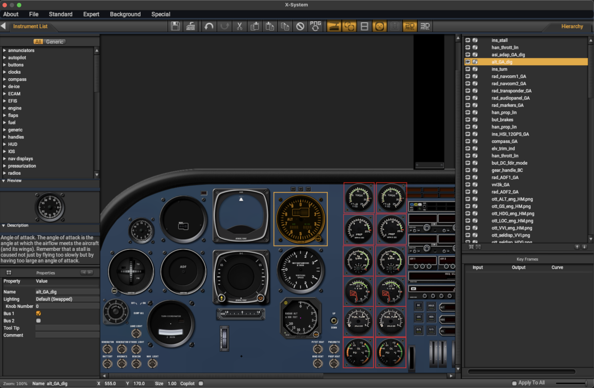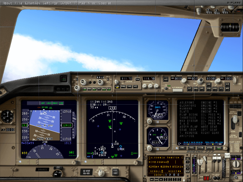 The 2D Panel editor is used to lay out an instrument panel intended to be used in 2D only. In order for the 2D panel to show in X-Plane, then a checkbox option to tell X-Plane to use the 2D panel must be enabled in *Viewpoint Menu > Cockpit Tab > Aircraft and Panel Visibility sub-panel. This checkbox is disabled by default. The image below shows a 2D panel in X-Plane 5 with a custom background image. 2D Panels are useful during initial flight model development and other applications where cockpit visuals are not a priority.