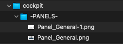 When the option to use a 2D panel is selected, then X-Plane will, by default, use the Background Image associated with the aircraft type selected in the Standard Menu > General Tab > Cockpit sub-panel > 2D Cockpit Pull-down menu. These background images have reserved names and are found in X-Plane/Resources/bitmaps/cockpit/-PANELS-/. If you wish to have a custom 2D panel background texture as shown in the above screenshot, then that texture needs to be located within your aircraft folder as shown below and with the same folder names. In addition, your texture filename must utilized the reserved name for the aircraft type selected. Most authors duplicate the appropriate background texture from the X-Plane's resource directory given above and modify it accordingly. The "dash-1" example below is used to create shadow overlays of your instrument panel, such as would be the case with glareshields.