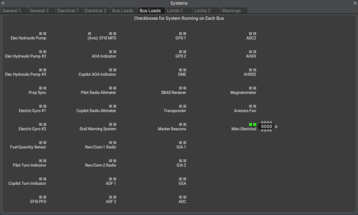 PlaneMaker's Standard > Systems > Bus Loads Tabs are used to assign equipment to electrical buses and specify their electrical load on those buses.