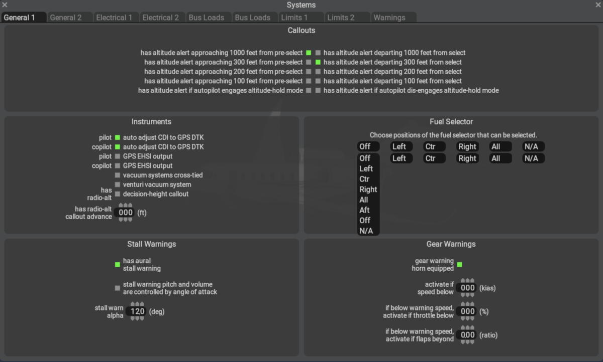 PlaneMaker's Standard > Systems > General 1 Tab is for setting several miscellaneous parameters. Hover over the widgets to see popup tooltips for more information about each widget.