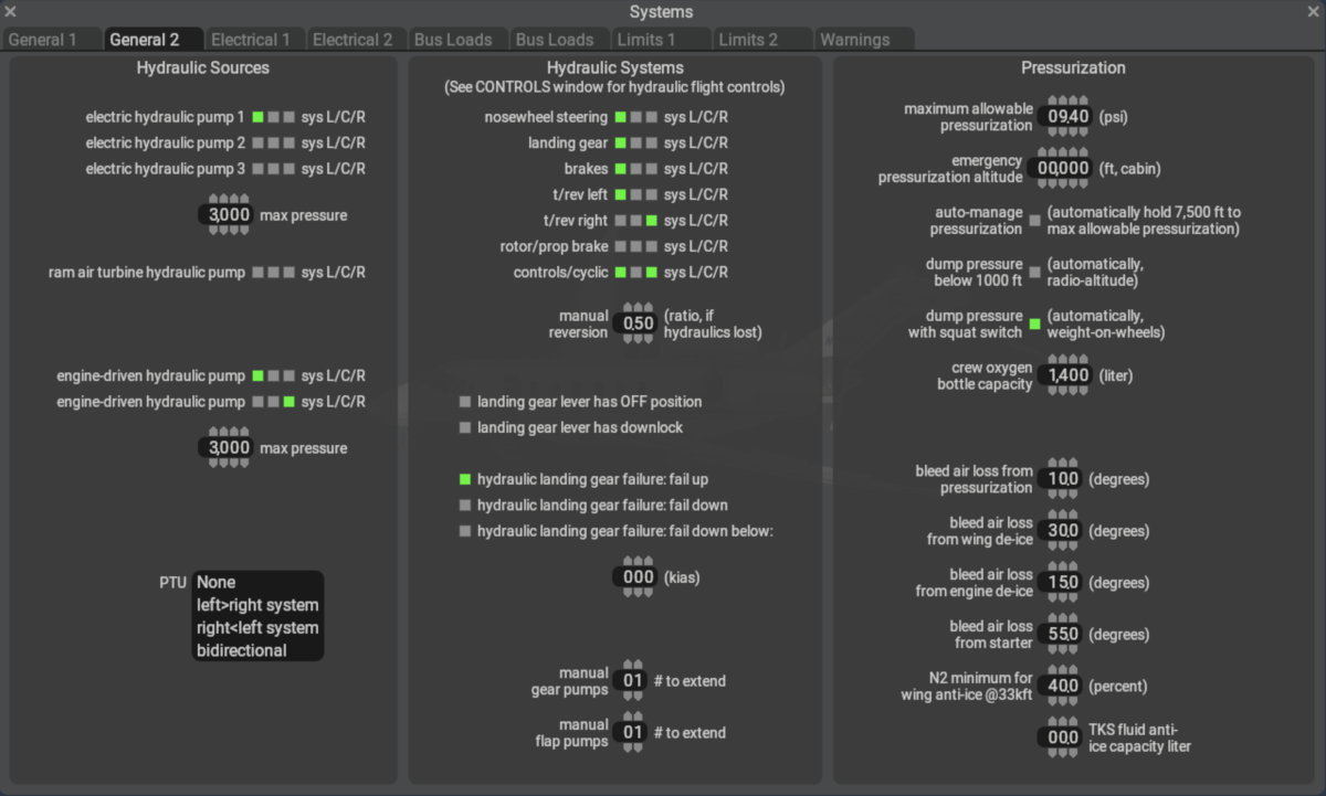 PlaneMaker's Standard > Systems > General 2 Tab is for configuring X-Plane's Hydraulic and Pressurization Systems. More information can be found in the Hydraulics section and Pneumatics sections of this manual.