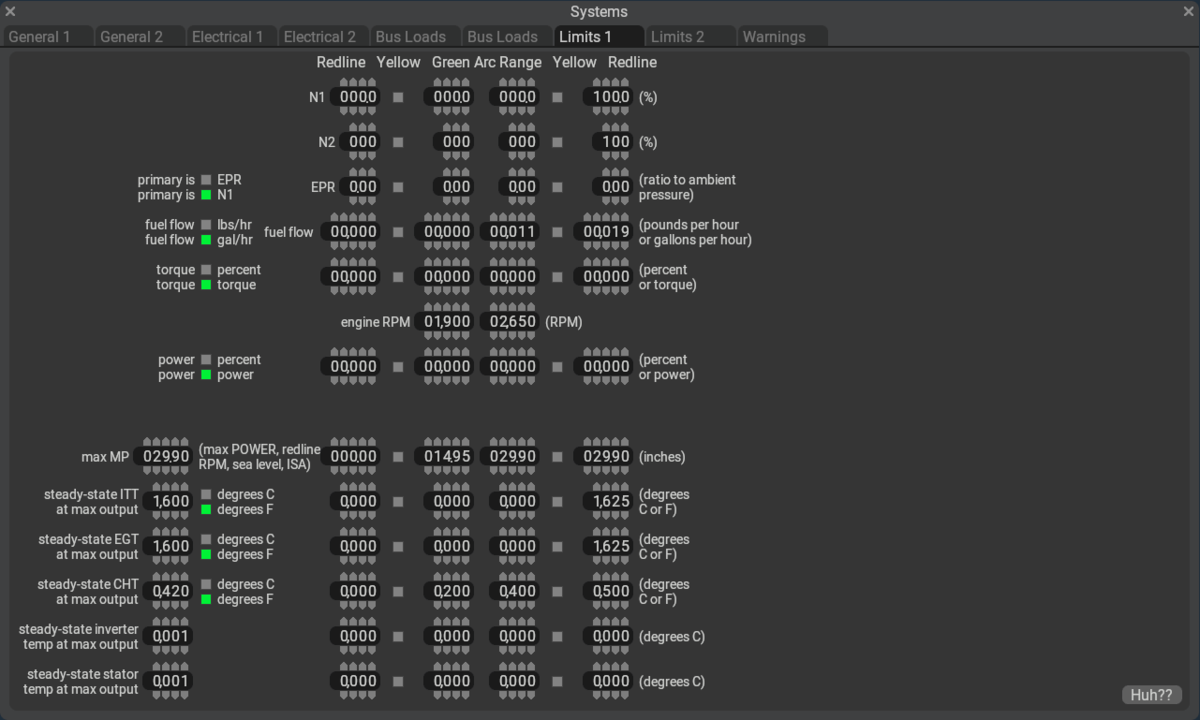 PlaneMaker's Standard > Systems > Limits 1 Tab is used to configure limiting values for a variety of mostly engine related parameters; however, there are a few limit settings not related to engines. In old versions of X-Plane with less refined systems models, and where 2D panels were prevalent, these limit values were only used to auto-generate 2D instrument graphics; however, those days are gone. As X-Plane have evolved and systems simulations have increased in fidelity, these simulations now depend on these limit values. You should endeavor to enter these values as best as you can for the best accuracy of your model.