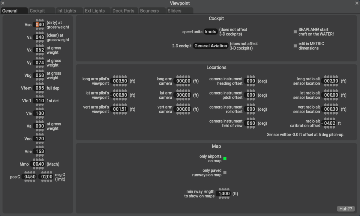 Thi General Tab of the Viewpoint Window is used to enter some generic, high-level meta data pertinent to the aircraft configuration. Several of these parameters are required to be entered before X-Plane will load your aircraft, so these should be filled out first whenever creating a new aircraft. Austin discusses this PlaneMaker page in the accompanying video below: