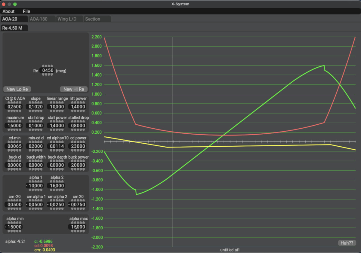 Airfoil Maker uses configurable parametric curves to shape specific regions of each type of curve, the goal being to tweak the overall curve shape to mimic the curves of the airfoil you want to model. By adjusting the various parameters, you can manipulate the total curve shapes. The end-result is a Laminar proprietary format Airfoil file with the file extension .afl. Laminar have several default .afl files available to all aircraft, but you can create your own, or modify existing ones.