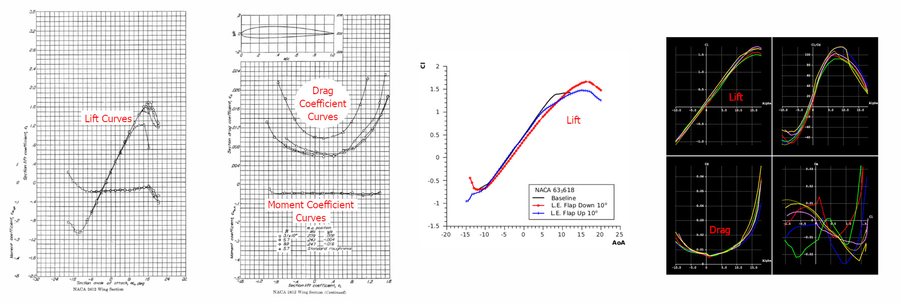 The image below shows some representative curves for 2D airfoil sections, established through both experimental (wind-tunnel) methods as well as computer methods. Multiple curve types are sometimes plotted on the same plot for easy comparisons. You may note that there are multiple overlaid plots for a given curve type. This is due to the variation of coefficients with respect to airspeed, or more specifically, the Reynolds Number, so it is typical to have a range of curve types over a range of Reynolds Numbers. Curves for each coefficient type have characteristic shapes, such that you may know the coefficient curves you're looking at simply from the general shape.