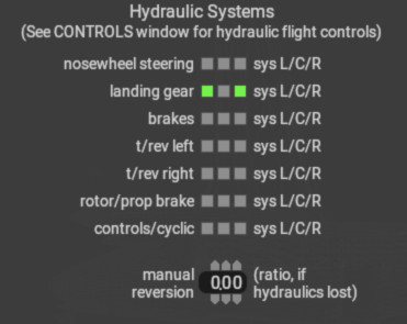 // The datarefs below act as 'valves' to the various hydraulic circuits. If you set the first one to 1, then the other