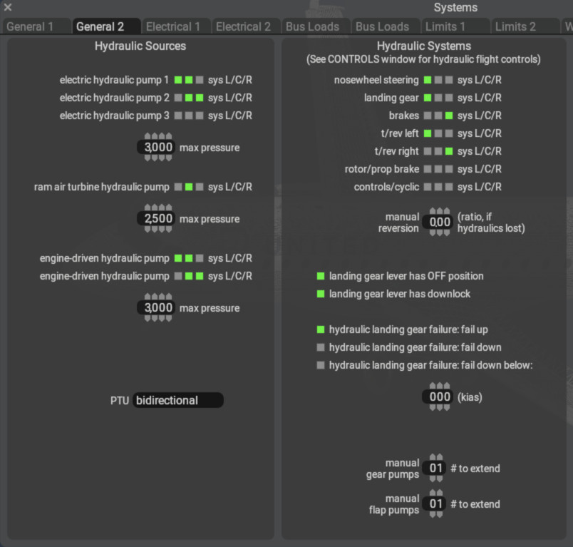 X-Plane models 5 hydraulic power sources, 3 hydraulic circuits, and a hydraulics Power Transfer Unit. Hydraulic System Settings can be found on PlaneMaker's Standard > Systems > General 2 Tab and also at Standard > Control Surfaces > Hydraulics Tab. Articulating components CAN (but do not have to) be assigned to one or more of the three hydraulic circuits. Assigning any component to a hydraulic circuit(s) will cause X-Plane to make their operation dependent upon hydraulic power availability and also be subject to hydraulic failures and diminished actuation rates with low hydraulic pressure/flow.