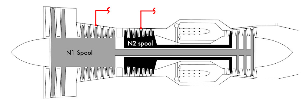 Pressurized air in small recip powered aircraft generally come from turbochargers and on turbine powered aircraft, comes from bleed air, i.e. air that is bled off (tapped) from a compressor section as shown in the illustration at right. Because a turbine engine's power output is a function of the compressor output pressure, then bleeding air from the compressor section is akin to a leak and will lower the engine power output slightly. The amount of power drawn from the engine by pneumatic systems may be configured in Standard > Systems > General 2 Tab > Pressurization Panel.