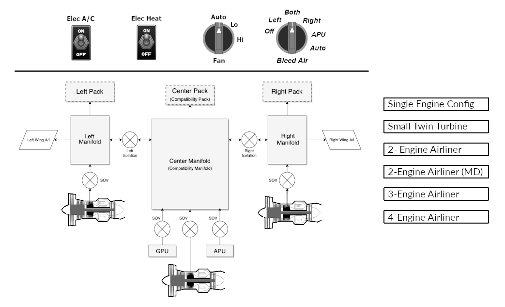X-Plane's pneumatic model is built around a center manifold, which supports backward-compatibly for airplanes created prior to XP 11.35. This center manifold is the most basic configuration and provides bleed air and pressurization capabilities for all aircraft. Aircraft created for X-Plane 11.35 and later can further implement a left/right or left/center/right pneumatic confguration. This model is illustrated via the diagram below.